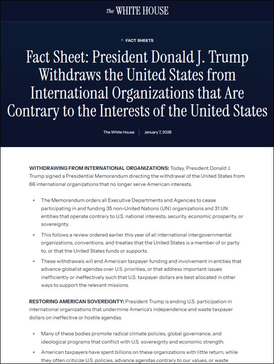 Fact Sheet: President Donald J. Trump Withdraws the United States from International Organizations that Are Contrary to the Interests of the United States (2026.01.07.) The White House