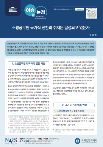 소방공무원의 국가직 전환으로 인력 충원 및 예산 확보 차원에서 긍정적인 효과가 있었으나, 여전히 소방예산 중 지방비의 비중이 높고, 지역 간 격차 해소 및 소방사무·인사·지휘체계 측면에서는 부족한 부분이 있다. 이에 ① 국가의 재정책임을 강화하고 새로운 소방재원 확보방안을 모색하며, ② 소방사무의 책임구조 명확성과 ③ 인사·지휘권 일관성을 확보함으로써 소방업무에서 국가의 책임을 강화할 필요가 있다.