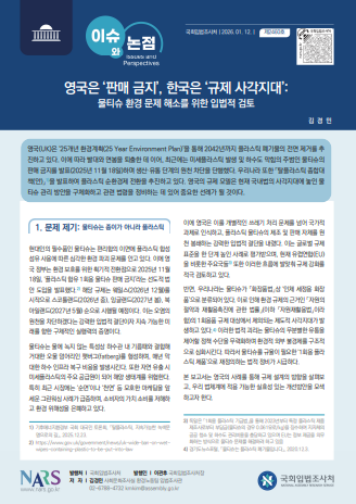 영국(UK)은 ‘25개년 환경계획(25 Year Environment Plan)’을 통해 2042년까지 플라스틱 폐기물의 전면 제거를 추진하고 있다. 이에 따라 빨대와 면봉을 퇴출한 데 이어, 최근에는 미세플라스틱 발생 및 하수도 막힘의 주범인 물티슈의 판매 금지를 발표(2025년 11월 18일)하며 생산·유통 단계의 원천 차단을 단행했다. 우리나라 또한 「탈플라스틱 종합대책(안)」 (기후에너지환경부 국회 대국민 토론회, 「탈플라스틱, 지속가능한 녹색문명으로의 길」, 2025.12.23.)을 발표하여 플라스틱 순환경제 전환을 추진하고 있다. 영국의 규제 모델은 현재 국내법의 사각지대에 놓인 물티슈 관리 방안을 구체화하고 관련 법령을 정비하는 데 있어 중요한 선례가 될 것이다.