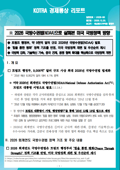 美 2026 국방수권법(NDAA)로 살펴본 미국 국방정책 방향