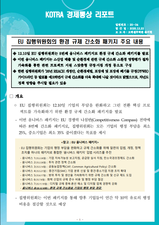 EU 집행위원회의 환경 규제 간소화 패키지 주요 내용