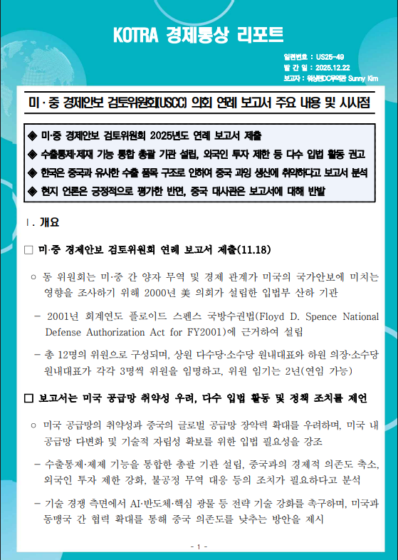 미·중 경제안보 검토위원회(USCC) 의회 연례 보고서 주요 내용 및 시사점