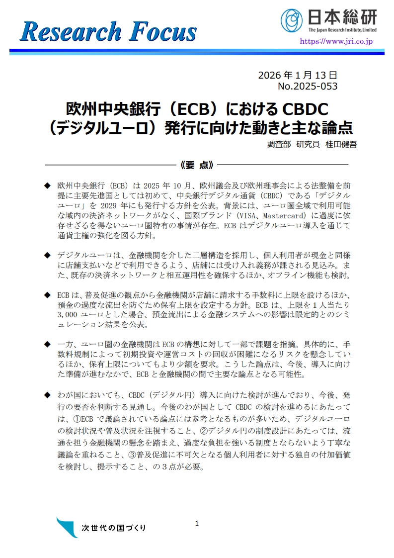 欧州中央銀行(ECB)におけるCBDC(デジタルユーロ)発行に向けた動きと主な論点