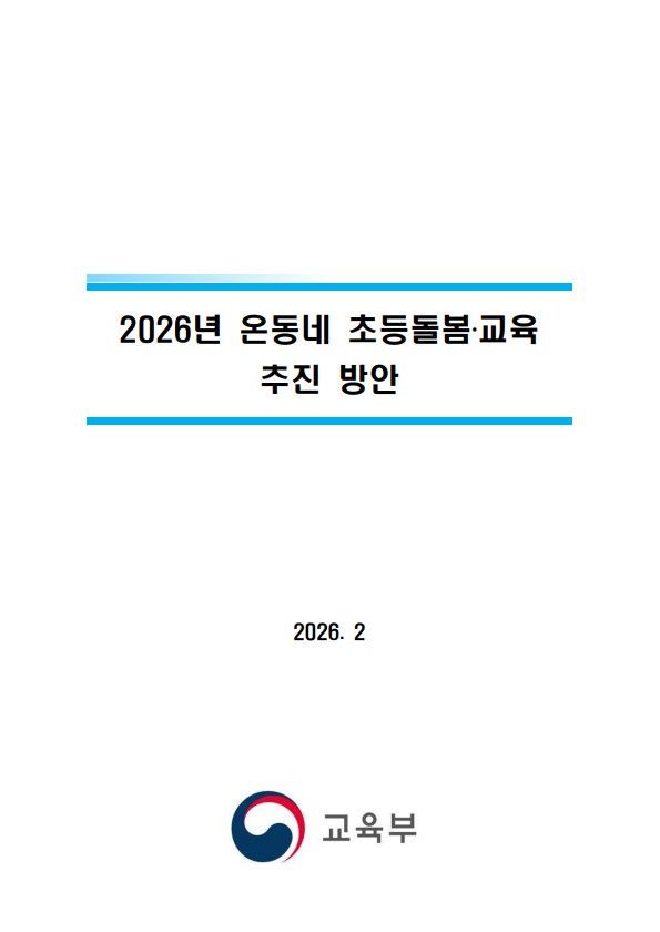 □ 교육부(장관 최교진)는 2월 3일(화), 초등돌봄·교육 정책 추진 방향과 2026년 주요 추진 과제를 담은 「2026년 온동네 초등돌봄·교육 추진 방안」을 발표함