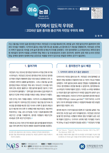 지난 2월 8일 치러진 일본 중의원선거에서 자민당은 316석을 확보해 단독 과반을 넘어 개헌 발의선까지 돌파하며 전후 최다 의석을 기록했다. 다카이치 총리는 취임 직후 허니문 효과를 노린 중의원 조기 해산을 단행했으며, 자민당은 선거에서 지역구 압승으로 의석을 크게 늘려 중의원 내 제도적 우위를 강화했다. 다만 참의원에서 소수여당이라는 제약과 중의원 재의결의 정치적 비용을 고려하면 연립 파트너 및 우호정당과의 조정이 관건이며, 방위력 강화·개헌 논의의 진전은 한일 관계와 동북아 정세에 부담 요인으로 작용할 우려가 있으므로 면밀한 대책의 강구가 필요하다.