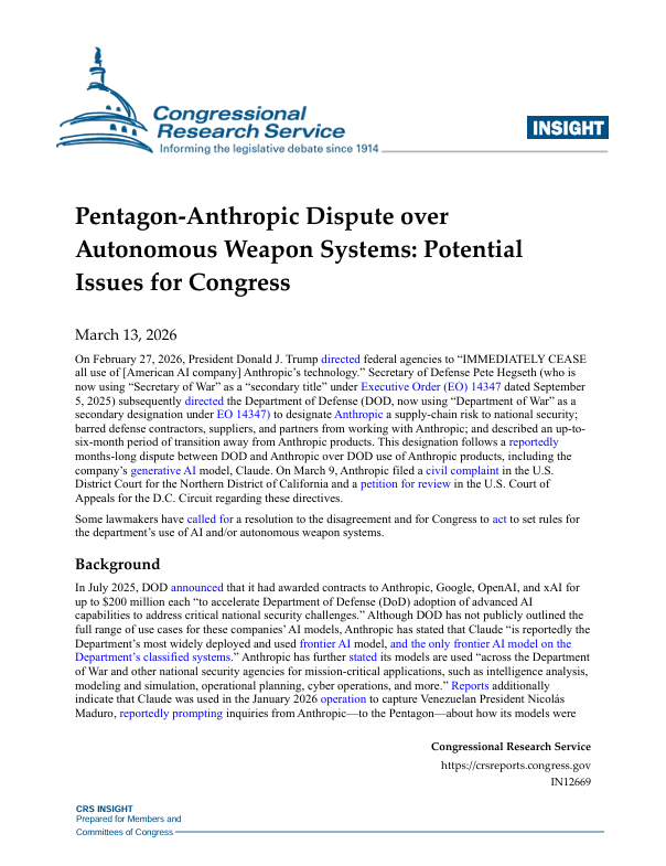 Pentagon-Anthropic Dispute over Autonomous Weapon Systems: Potential Issues for Congress
