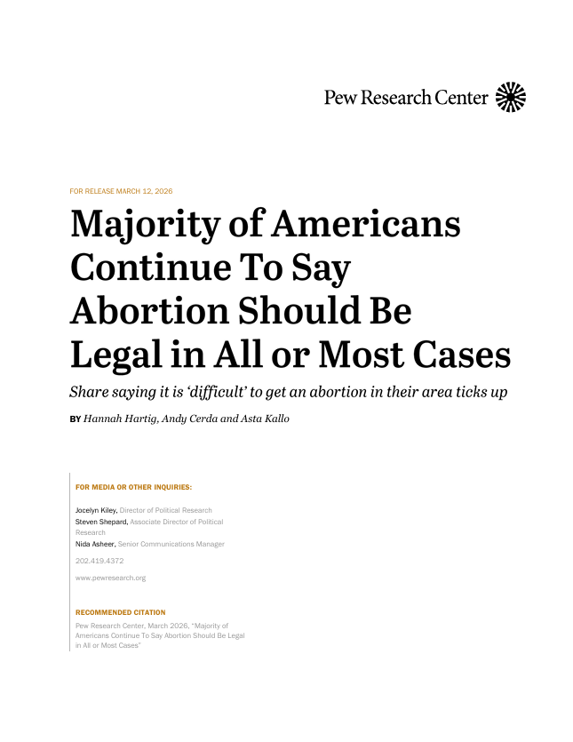 Majority of Americans Continue to Say Abortion Should Be Legal in All or Most Cases: Share saying it is ‘difficult’ to get an abortion in their area ticks up