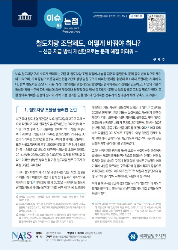노후 철도차량 교체 수요가 확대되는 가운데 철도차량 조달 과정에서 납품 지연과 품질관리 문제 등이 반복적으로 제기되고 있으며, 가격 중심으로 운영되는 현행 2단계 경쟁 입찰 구조가 이러한 문제를 충분히 해소하지 못한다는 지적이 있다. 향후 철도차량 조달 시 기술·가격·이행역량을 종합적으로 반영하는 평가체계로의 전환을 검토하고, 사업의 기술적 특성과 위험 수준에 따라 협상에 의한 계약이나 경쟁적 대화 방식 등 다양한 조달 방식의 활용도 고려할 필요가 있다. 또한 생애주기비용 관점의 평가와 계약 이행 성과를 입찰 평가에 연계하는 전주기적 성과관리 체계 구축도 요구된다.