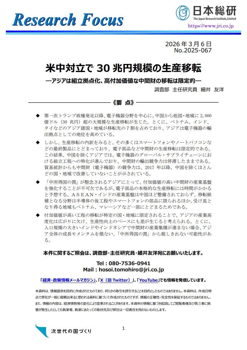 米中対立で30 兆円規模の生産移転 ― アジアは組立拠点化、高付加価値な中間財の移転は限定的 ―