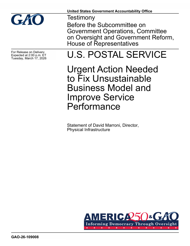 U.S. Postal Service: Urgent Action Needed to Fix Unsustainable Business Model and Improve Service Performance