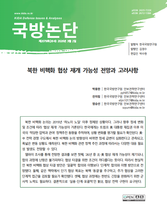 델파이 조사를 통해 전망한 결과를 보면 첫째, ’26년 중 北・美 협상 재개 가능성이 제기되나, 합의 과정에 난항은 불가피하다. 협상 타결을 위한 조건이 까다롭다는 뜻이다. 따라서 현실적 인 북한 비핵화 협상 타결 방안은 ‘일괄적’ 합의와 이행보다 ‘단계적’ 합의와 이행 방안으로 전 망됐다. 둘째, 같은 맥락에서 단기 협상 목표는 북핵 ‘동결’을 추구하고, 추가 협상을 고려한 단계적 접근을 검토할 필요가 확인됐다. 셋째, 협상 과정에는 한반도 긴장을 완화하기 위한 군 사적 노력도 필요하다. 결론적으로 ‘실용・단계・포괄적’인 對北 협상 전략 구현이 요구된다.