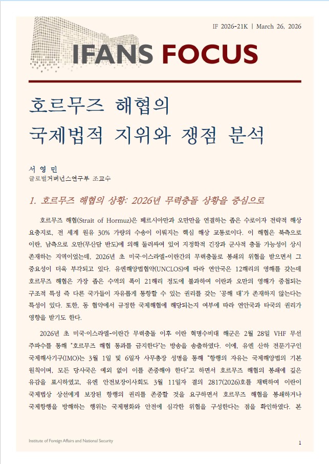 본 보고서는 이러한 상황을 감안하여 국제법상 호르무즈 해협의 법적지위와 무력충돌시 동 수역을 둘러싼 법적쟁점에 대해 분석해 보고자 한다.