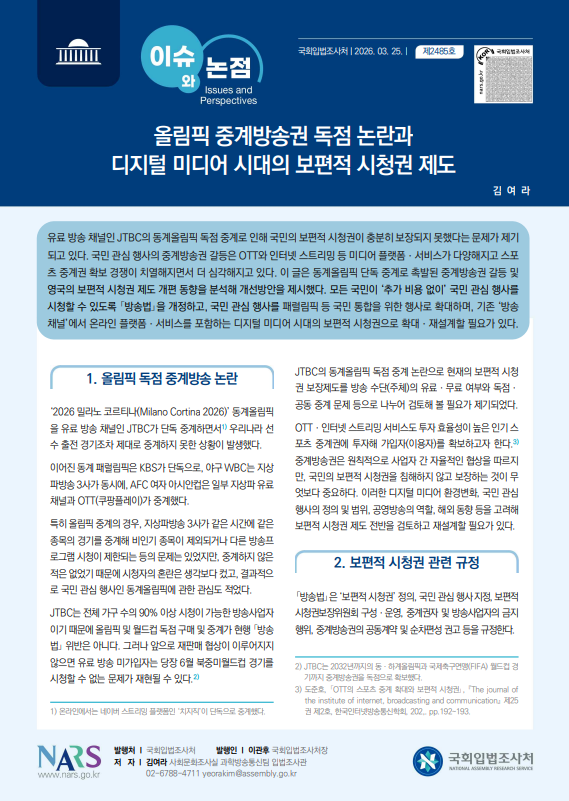 유료 방송 채널인 JTBC의 동계올림픽 독점 중계로 인해 국민의 보편적 시청권이 충분히 보장되지 못했다는 문제가 제기되고 있다. 국민 관심 행사의 중계방송권 갈등은 OTT와 인터넷 스트리밍 등 미디어 플랫폼ㆍ서비스가 다양해지고 스포츠 중계권 확보 경쟁이 치열해지면서 더 심각해지고 있다. 이 글은 동계올림픽 단독 중계로 촉발된 중계방송권 갈등 및 영국의 보편적 시청권 제도 개편 동향을 분석해 개선방안을 제시했다. 모든 국민이 ‘추가 비용 없이’ 국민 관심 행사를 시청할 수 있도록 「방송법」을 개정하고, 국민 관심 행사를 패럴림픽 등 국민 통합을 위한 행사로 확대하며, 기존 ‘방송 채널’에서 온라인 플랫폼ㆍ서비스를 포함하는 디지털 미디어 시대의 보편적 시청권으로 확대ㆍ재설계할 필요가 있다.