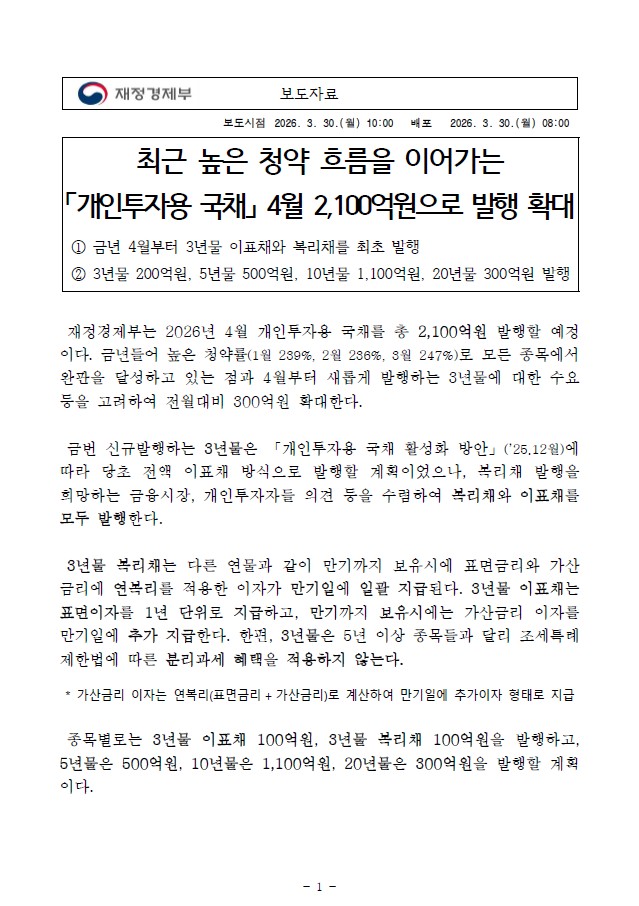 최근 높은 청약 흐름을 이어가는 개인투자용 국채 4월 2,100억원 발행 예정