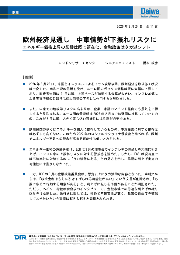 欧州経済見通し 中東情勢が下振れリスクに: エネルギー価格上昇の影響は既に顕在化、金融政策はタカ派シフトト