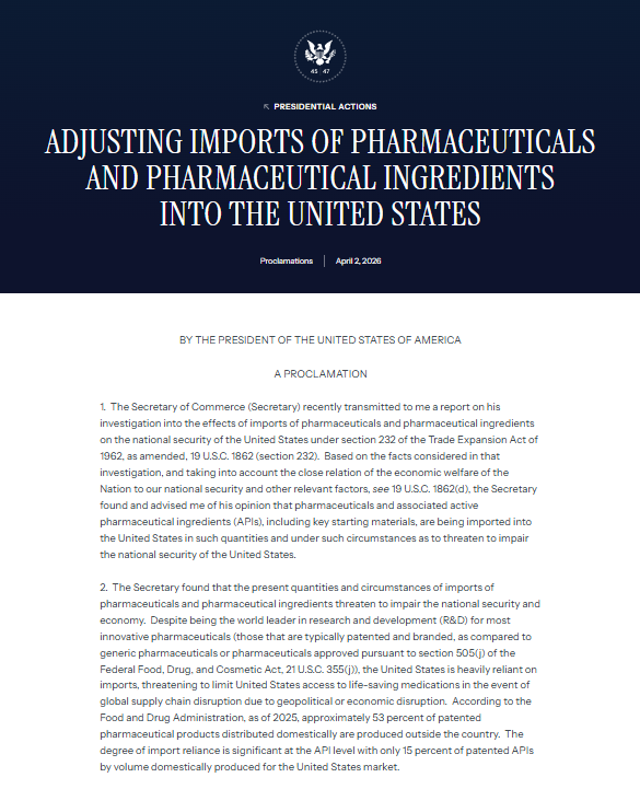 Adjusting Imports of Pharmaceuticals and Pharmaceutical Ingredients into the United States (2026.04.03.) / The White House