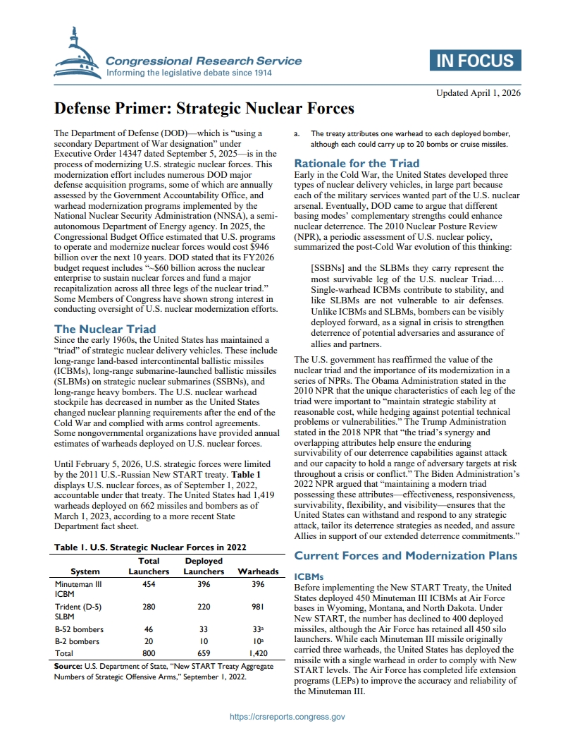 Defense Primer: Strategic Nuclear Forces (Updated April 1, 2026)