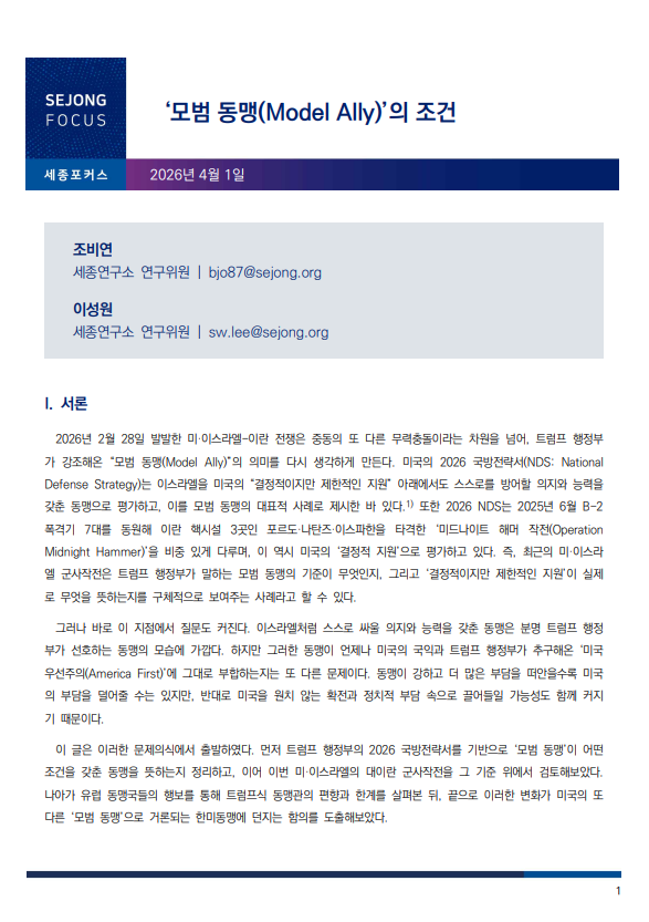□ 2026년 2월 28일 발발한 미·이스라엘-이란 전쟁은 트럼프 행정부가 강조해온 “모범 동맹(Model Ally)”의 의미를 다시 생각하게 만듦