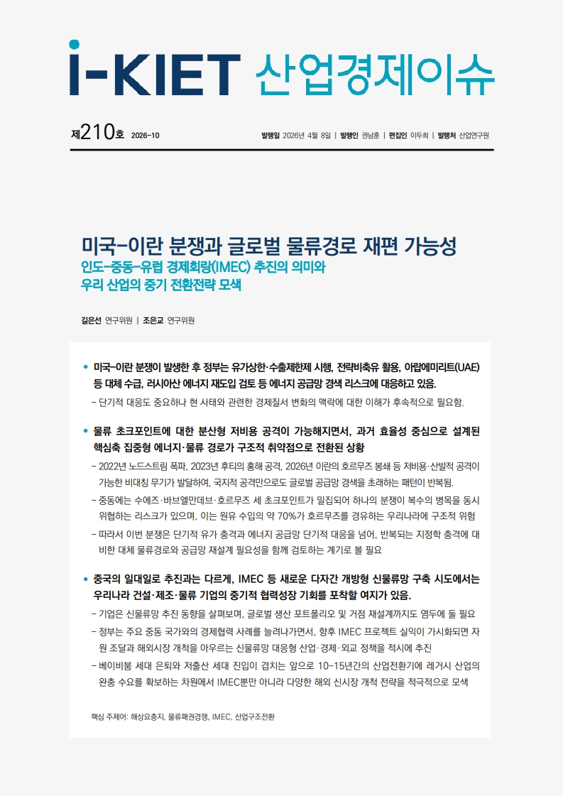 ㅇ 산업연구원(KIET)은 2026년 4월 8일 발간한 '미국-이란 분쟁과 글로벌 물류경로 재편 가능성' 보고서에서 미·이란 분쟁으로 호르무즈 해협 등 주요 물류 요충지의 리스크가 구조화됨에 따라 인도-중동-유럽 경제회랑(IMEC) 참여를 통한 중기 전략을 모색해야 한다고 제언했음