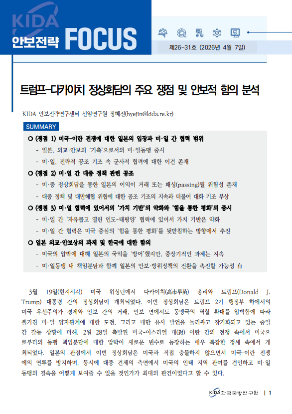 트럼프-다카이치 정상회담의 주요 쟁점 및 안보적 함의 분석