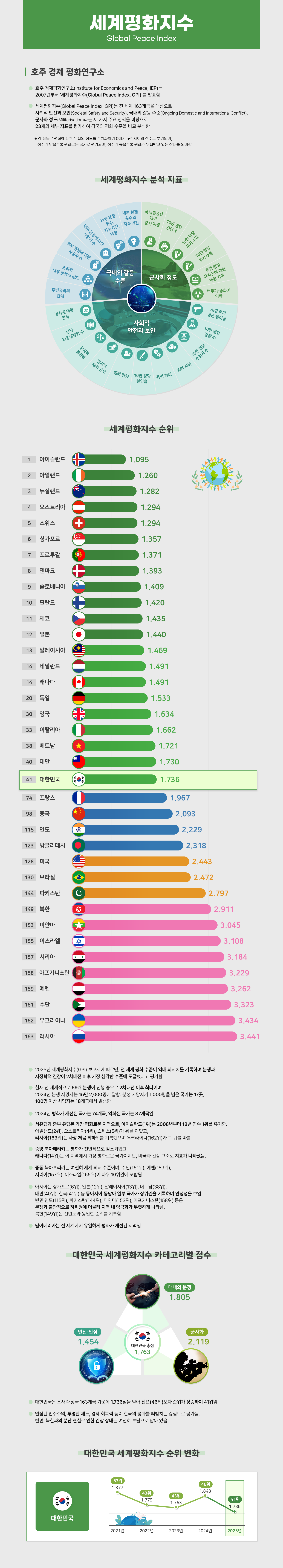 전세계 가장 평화로운 국가 아이슬란드…한국 41위·북한 149위 (2025.08.31.) / 연합뉴스