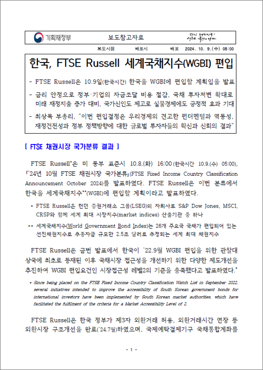 - [보도참고] 한국, FTSE Russell 세계국채지수(WGBI) 편입 (2024.10.09.) / 기획재정부