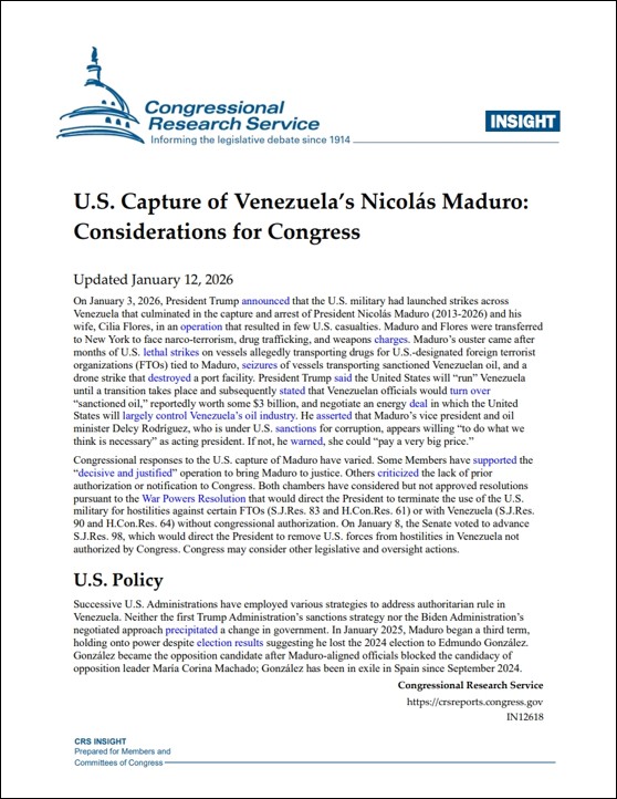 - U.S. Capture of Venezuela’s Nicolás Maduro: Considerations for Congress (2026.01.12.) /