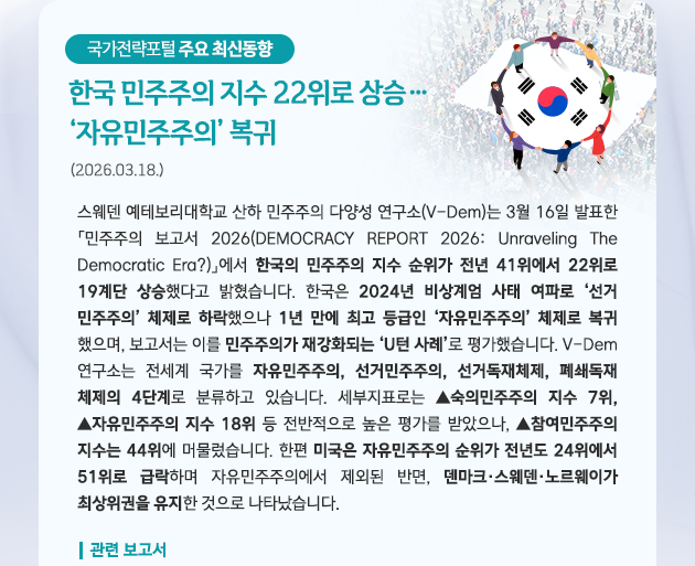 [국가전략 뉴스레터 2026-4월호] 한국 민주주의 지수 22위로 상승… '자유민주주의' 복귀