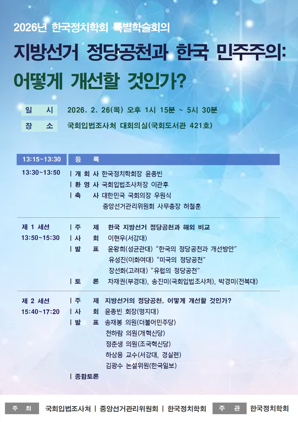 [2026년 한국정치학회 특별학술회의] 지방선거 정당공천과 한국 민주주의 공동 세미나 : 어떻게 개선할 것인가?